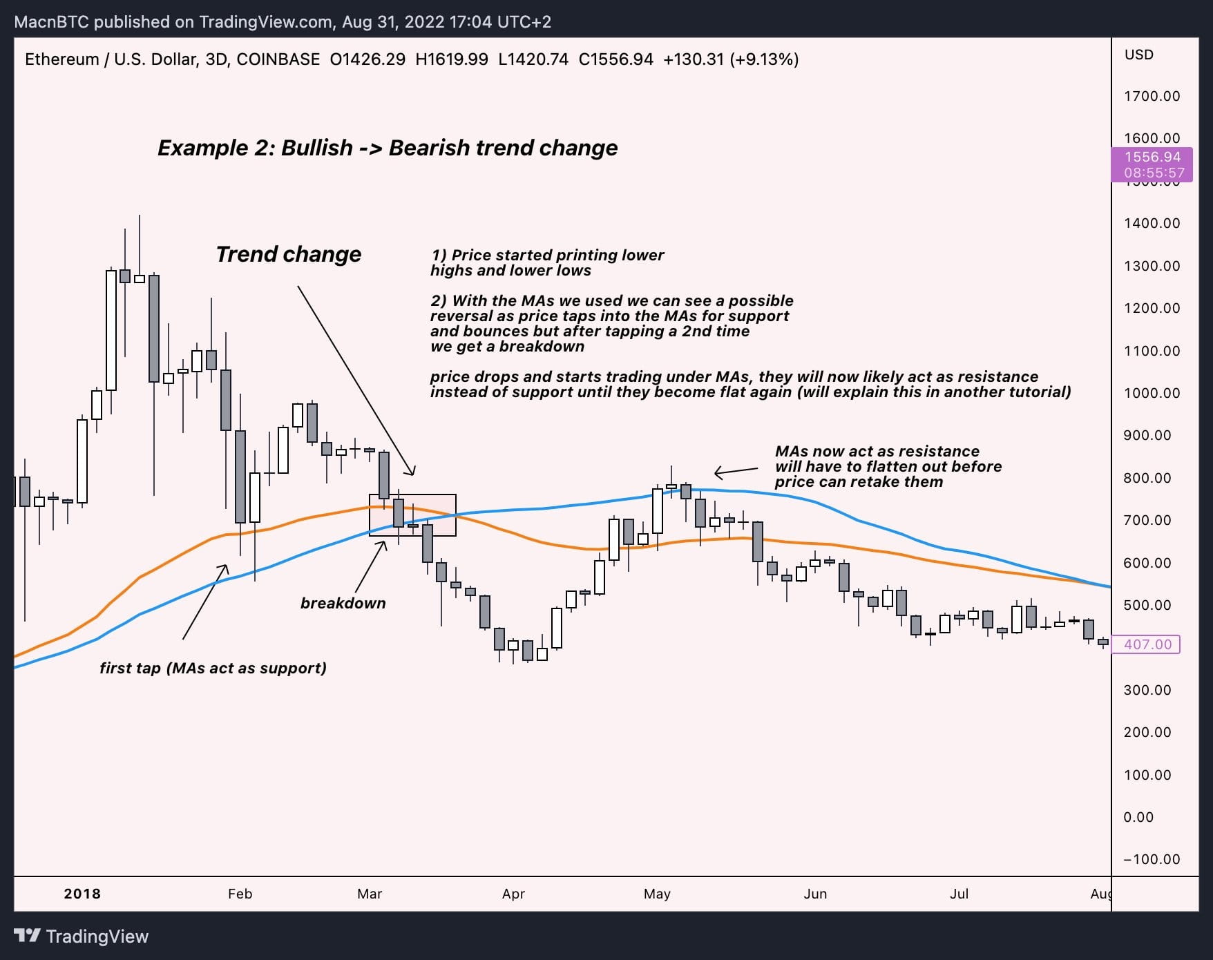 Как мы узнаем, что актив имеет медвежий тренд? Давайте посмотрим на этот пример медвежьего тренда. Это $ETH на 3D, но на этот раз я добавил еще две MA, чтобы продемонстрировать, как они могут дать нам больше подтверждения.