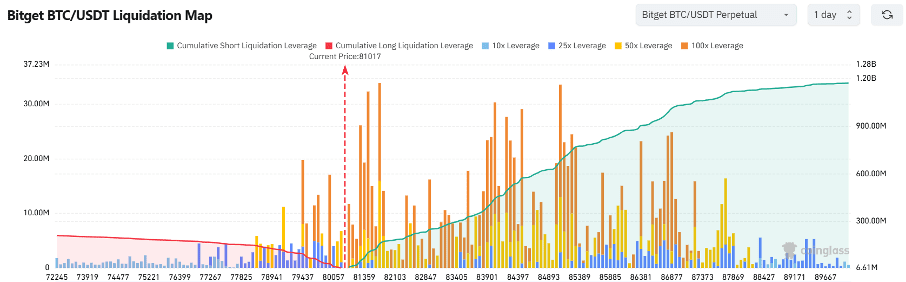 3.На данный момент, находясь на уровне 81,017 USDT, Биткойн находится в потенциальной зоне ликвидации. Падение на 1000 пунктов до около 80,017 USDT может вызвать ликвидации по длинным позициям на сумму более $15 миллионов. В то же время, рост до 82,017 USDT может привести к ликвидациям коротких позиций на сумму более $187 миллионов. Объемы ликвидации по коротким позициям значительно превышают длинные, поэтому рекомендуется осторожно управлять плечом, чтобы избежать масштабных ликвидаций.