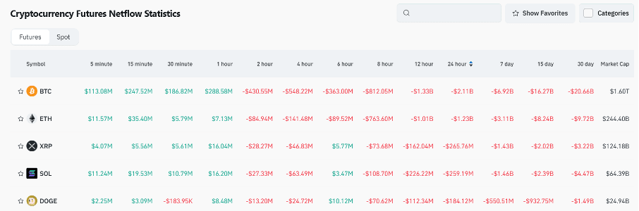 5.За последние 24 часа $BTC, $ETH, $XRP, $SOL и $DOGE возглавили по чистым оттокам в фьючерсной торговле, сигнализируя о потенциальных торговых возможностях.