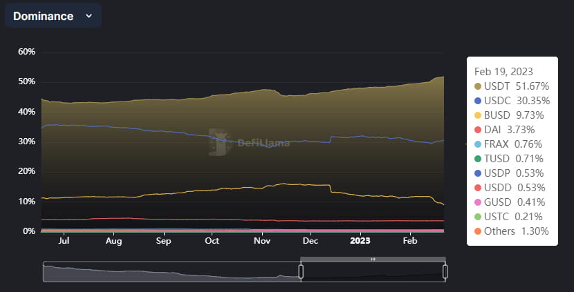После того, как появились новости о том, что BUSD столкнулся с проблемами, деньги, конечно же, начали перемещаться в крипто-ландшафт. Следующие диаграммы показывают доминирование 10 крупнейших стейблкоинов в зависимости от их рыночной капитализации.