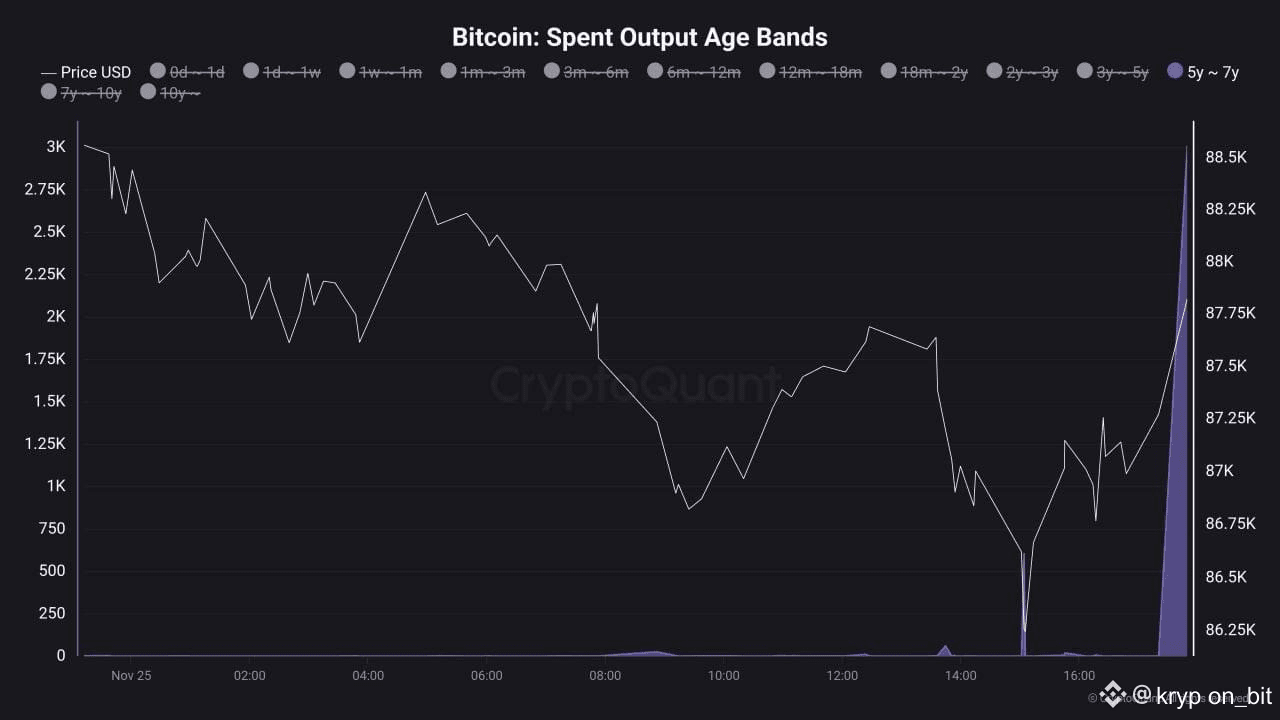 Еще один интересный сигнал — активация долгих монет возрастом 5–7 лет. Около 3006 BTC из этой группы недавно вышли из состояния покоя. Для рынка это обычно означает изменение поведения «старых» кошельков. Такие движения могут указывать либо на перебалансировку, либо на подготовку к дальнейшей активности. Но паниковать тут не стоит — подобные события сами по себе не являются медвежьим сигналом, важно смотреть на дальнейшее поведение цены.