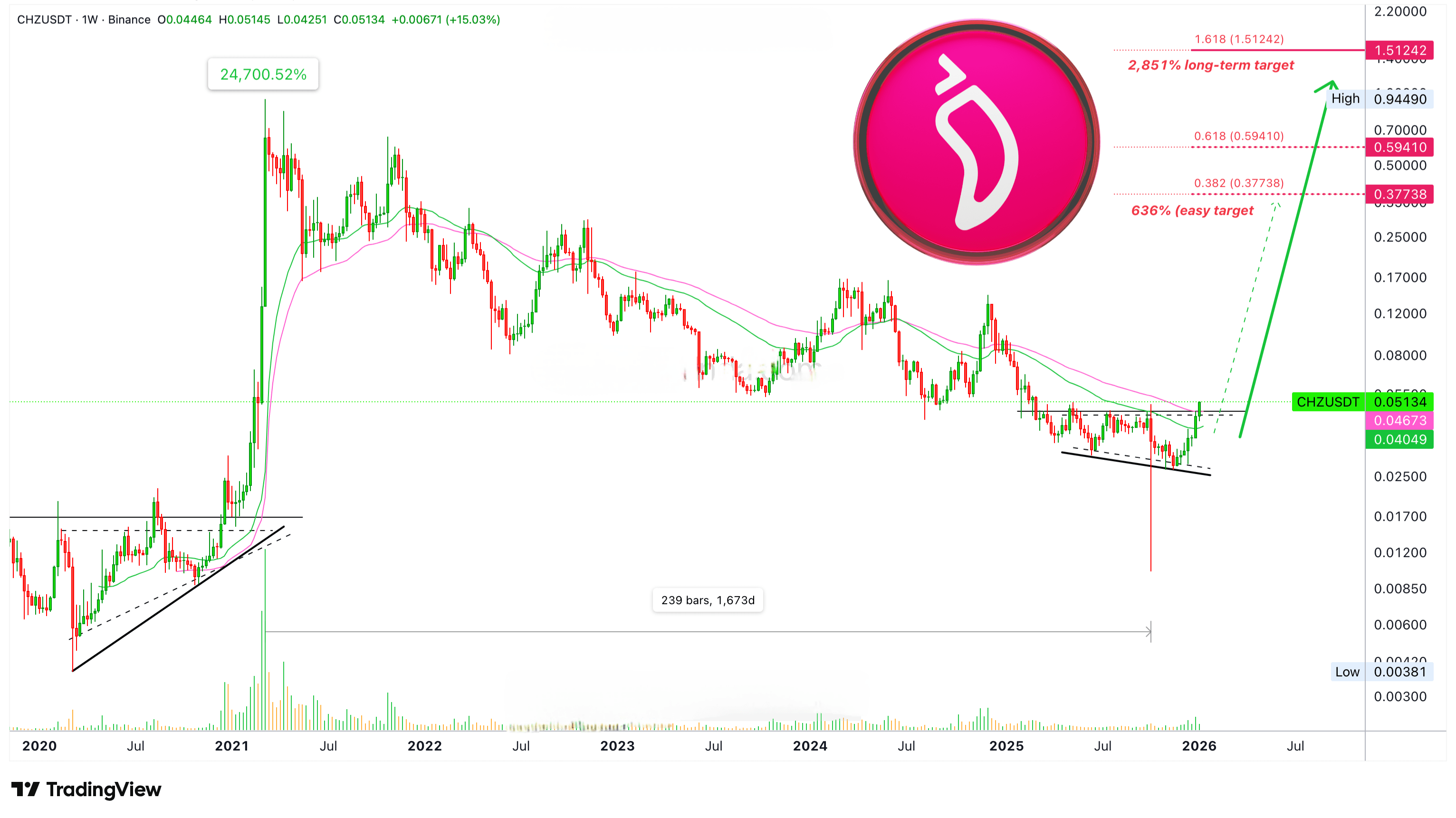 В 2020 году CHZUSDT продемонстрировал низ, похожий на октябрь 2025 года. За этим последовал мега-бычий рынок, составивший 24 700%. Я сомневаюсь, что мы увидим такой сильный рост, но он все равно будет огромным, и сигналы уже полностью подтверждены.
