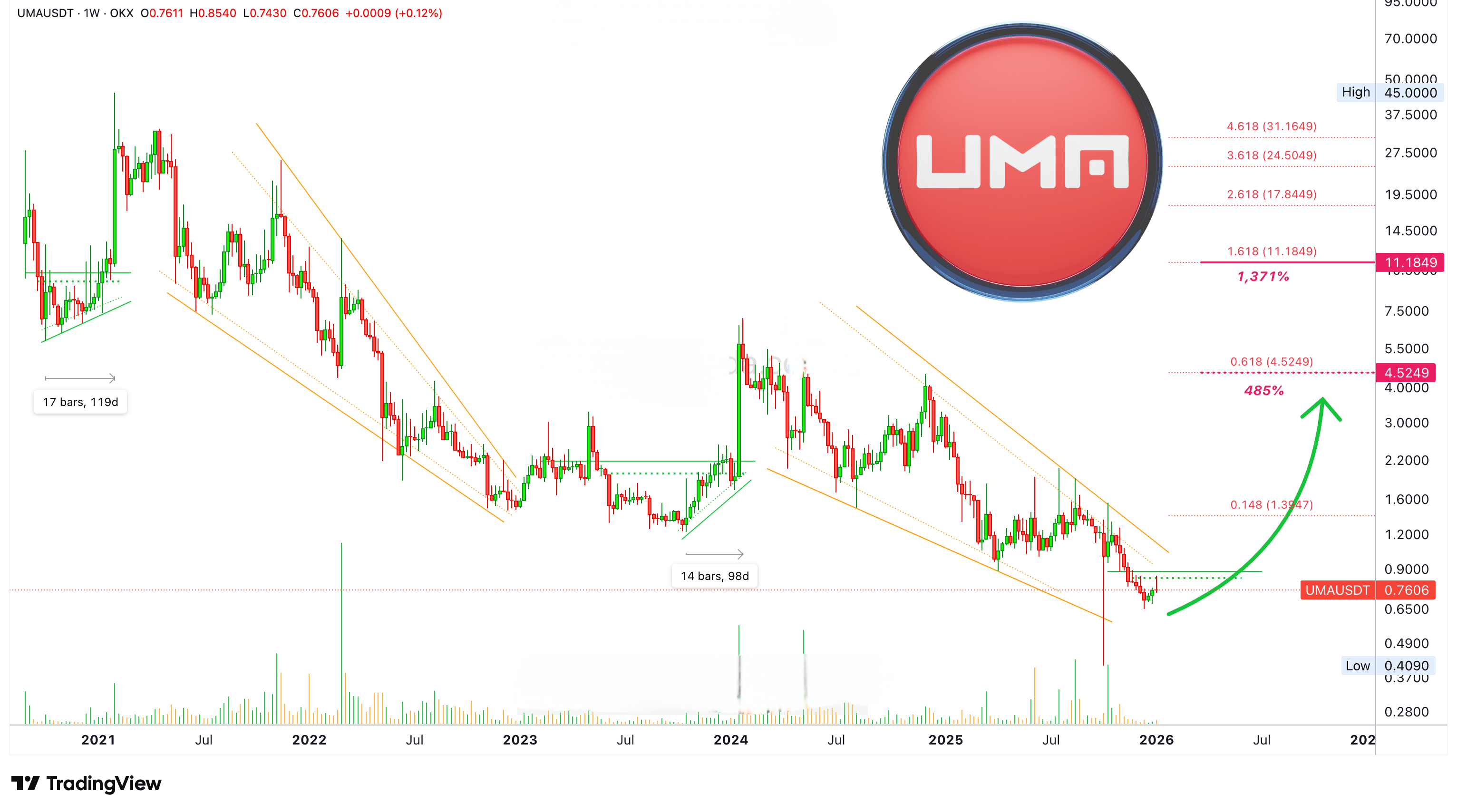 UMAUSDT становится зелёным, и мы ожидаем сильную бычью волну, которая приведёт к минимальному росту на 485%. После некоторой паузы или коррекции мы можем ожидать дополнительного роста.