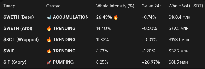 • $WETH (Base) — Китовая аккумуляция: Зафиксировано максимальное значение интенсивности китов — 26,49%. Это означает, что более четверти капитализации актива в сети Base было прокручено крупными игроками за последние 24 часа. Это мощный сигнал к накоплению ликвидности в экосистеме Coinbase.