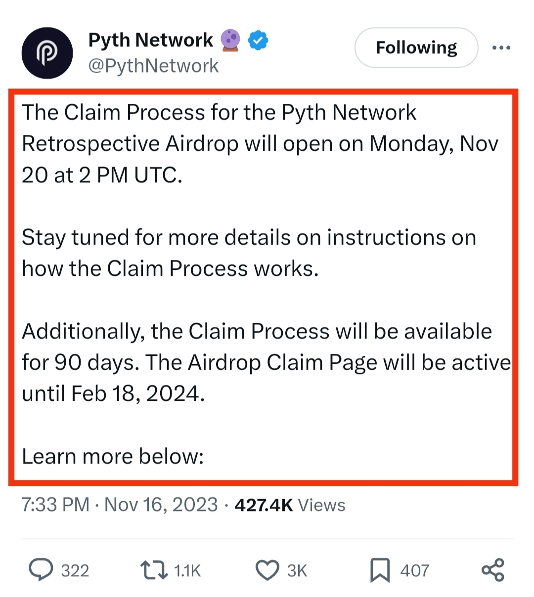 Please note that, as of November 1, 2023, the date when eligible participants can claim their airdrop allocations has not been announced. You can follow the official Pyth Network social channels to stay updated.