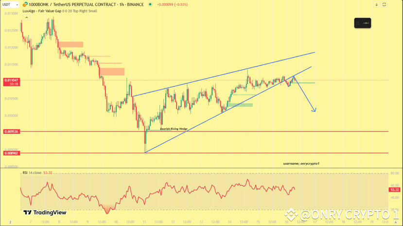 This chart shows the 1000BONK/USDT perpetual contract on Binance with a bearish rising wedge pattern. A breakdown is expected, indicated by the downward arrow. Support levels are marked at 0.009536 and 0.008902. The RSI at 53.32 suggests neutral momentum. A drop may occur if price breaks below the wedge, confirming bearish sentiment.