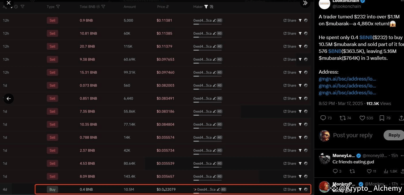 A trader turned 232 into over 1.1 million on $MUBARAK—a 4,860x return! 😱