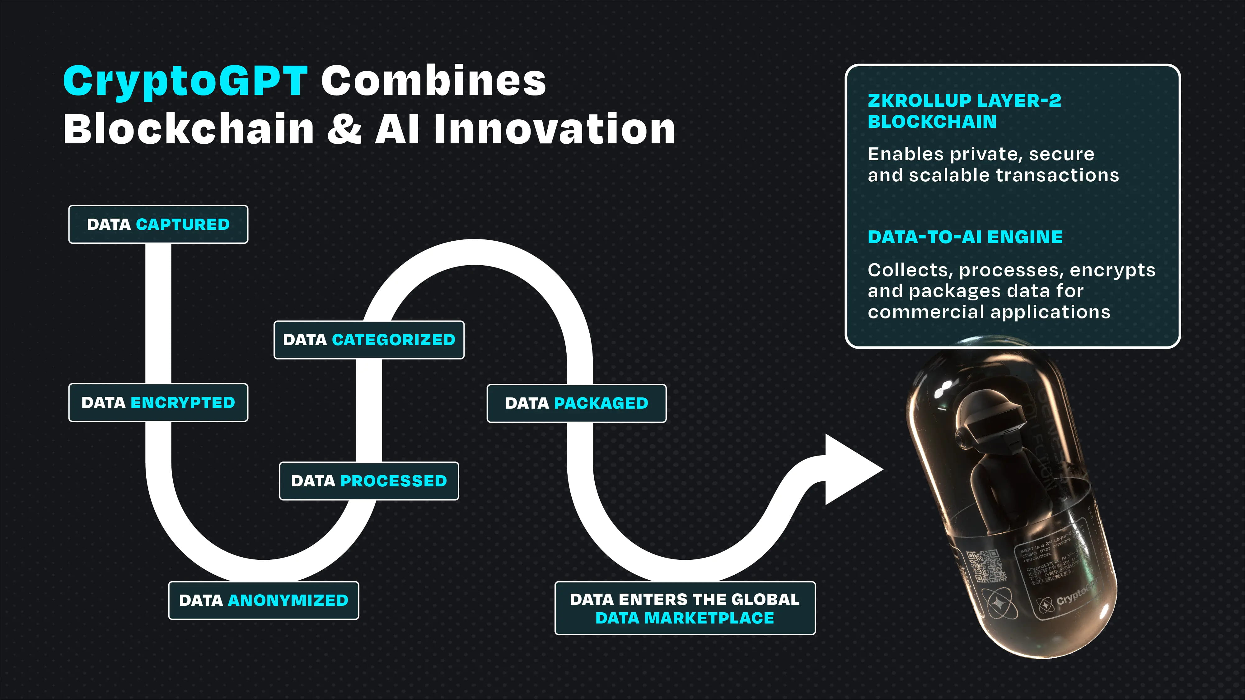 ► CryptoGPT is an Ethereum zk Layer-2 blockchain for AI development. By using a low-cost, secure, safe, and private zkRollup technology it turns the data into a valuable asset- used in AI models to generate value creation in many industries. Moreover, it develops a Data-to-AI Engine that gathers, processes, secures, and packages data for commercial applications.