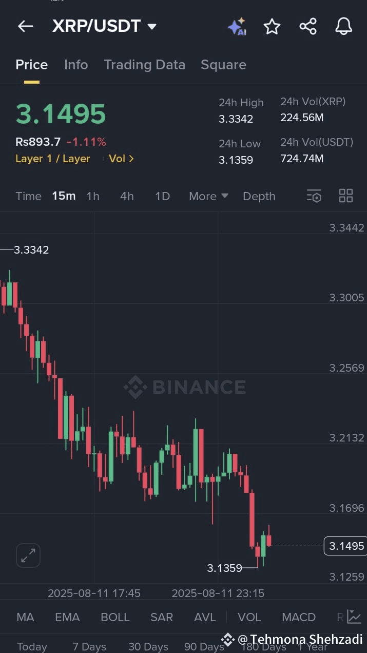 XRP has been on a steady decline, recently dipping to an intraday low of 3.1359 before staging a minor bounce. However, bearish momentum continues to dominate, and a drop below the 3.1350 level could open the door for further downside toward deeper support areas.