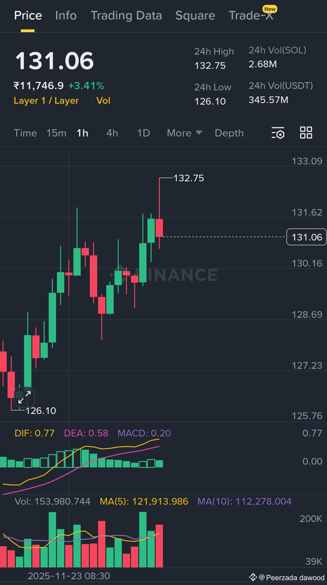 • Recent High Rejection: The last couple of candles show the price attempting to push toward the 24h High of 132.75 but failing to hold that level, resulting in an upper wick and a move back down towards the current price of 131.06. This indicates selling pressure entering the market at the top.