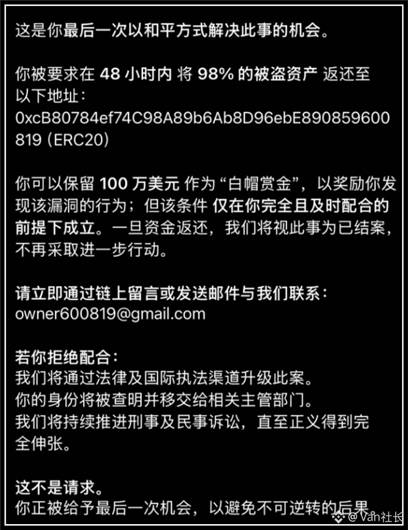 这位失主现在的反应也是相当“硬核”,给黑客写了一封措辞极度强硬的信,不是跪求退款,而是霸气威胁。允许黑客保留100万USDT,其余必须马上返还!