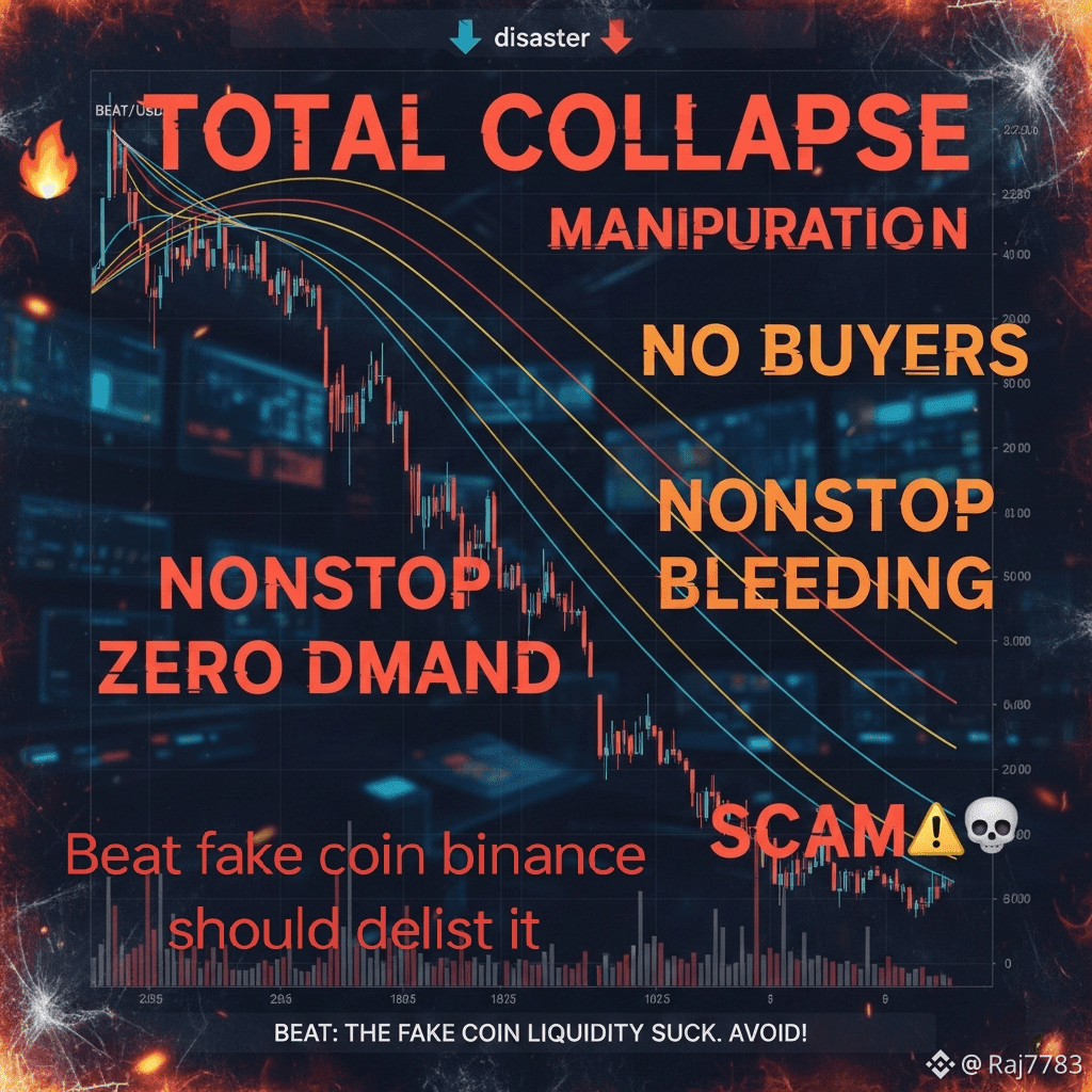 BEAT is a complete disaster 📉🔥. This chart screams manipulation, distribution, and total collapse. No buyers, no volume, no recovery — just nonstop bleeding. EMAs are miles above price, confirming a dead trend. This is exactly how a beat fake coin operates: hype, pump, trap, dump. Calling it a beat fake coin scam is justified when price keeps grinding to new lows with zero demand. There is no structure, no momentum, no future here. BEAT is nothing but a zero value coin sucking liquidity from retail traders 💀⚠️. Avoid before it nukes further