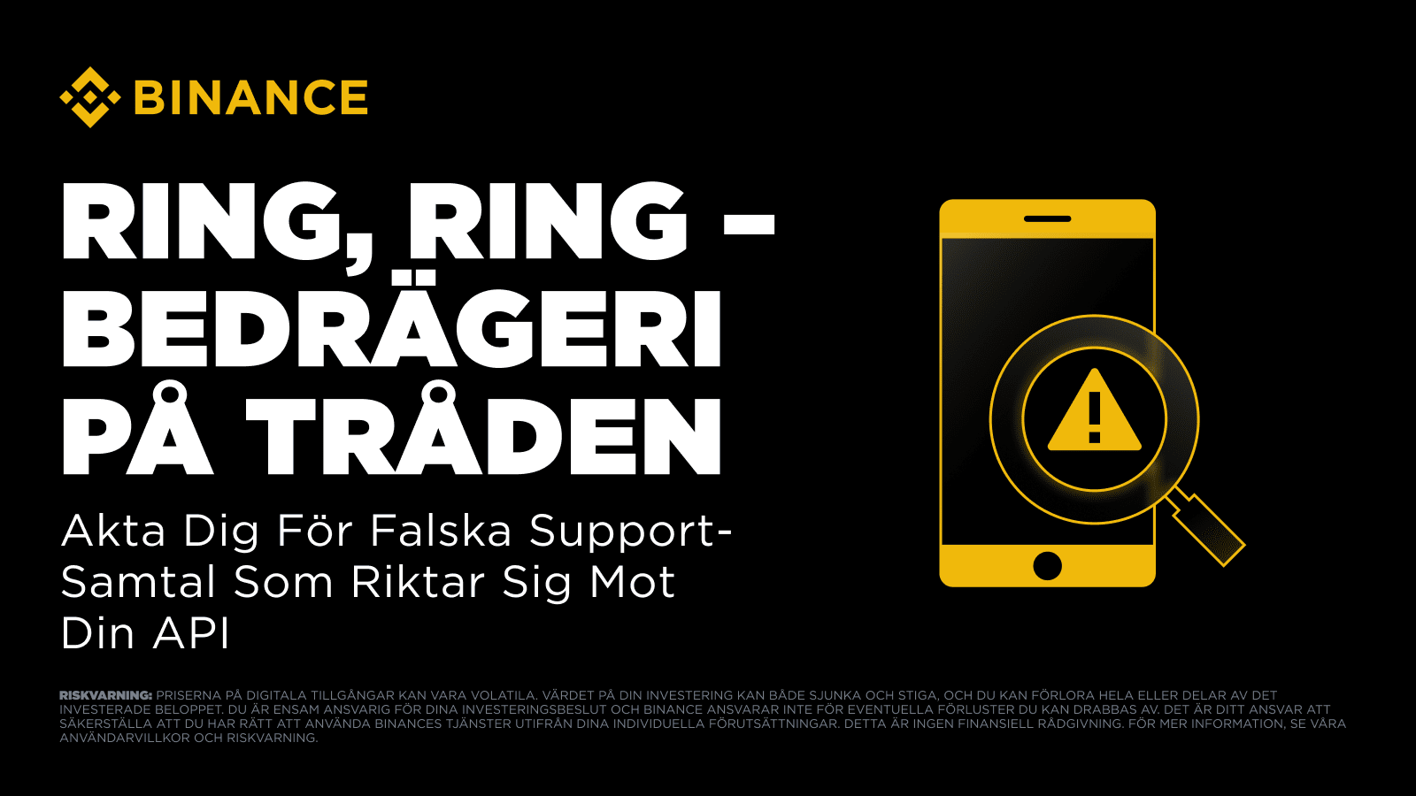 Det börjar med ett telefonsamtal som kan verka legitimt: numret ser ”officiellt” ut och rösten i andra änden låter professionell och övertygande, precis som en riktig kundtjänstmedarbetare. Med hjälp av falska nummer eller IP-telefoni kontaktar bedragarna sina offer med brådskande varningar: ”Ditt Binance-konto kan vara i fara. Vi behöver omedelbart justera dina API-inställningar för att skydda dina tillgångar.”