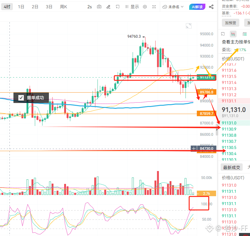 BTC昨天晚盘大盘89240起来反弹到90700-91200区间,目前在压力带里面,小级别这里走了背离,这里破不了还会继续下,下面支撑89000,86500,84500,这里破位上到92000-92500回踩91200-90700不破看高一线到94500