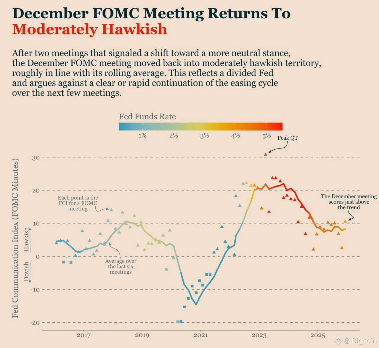 Anh em nhìn cái chart này thì sẽ thấy Fed đang khá là mâu thuẫn. Bên ngoài, trong buổi họp báo tháng 12, Powell giữ giọng khá trung tính, không muốn làm thị trường hoảng. Nhưng khi đọc FOMC minutes và nhìn vào Fed Communication Index thì câu chuyện lại khác: Fed đã quay trở lại trạng thái moderately hawkish, tức là hơi “diều hâu” hơn mức trung lập.