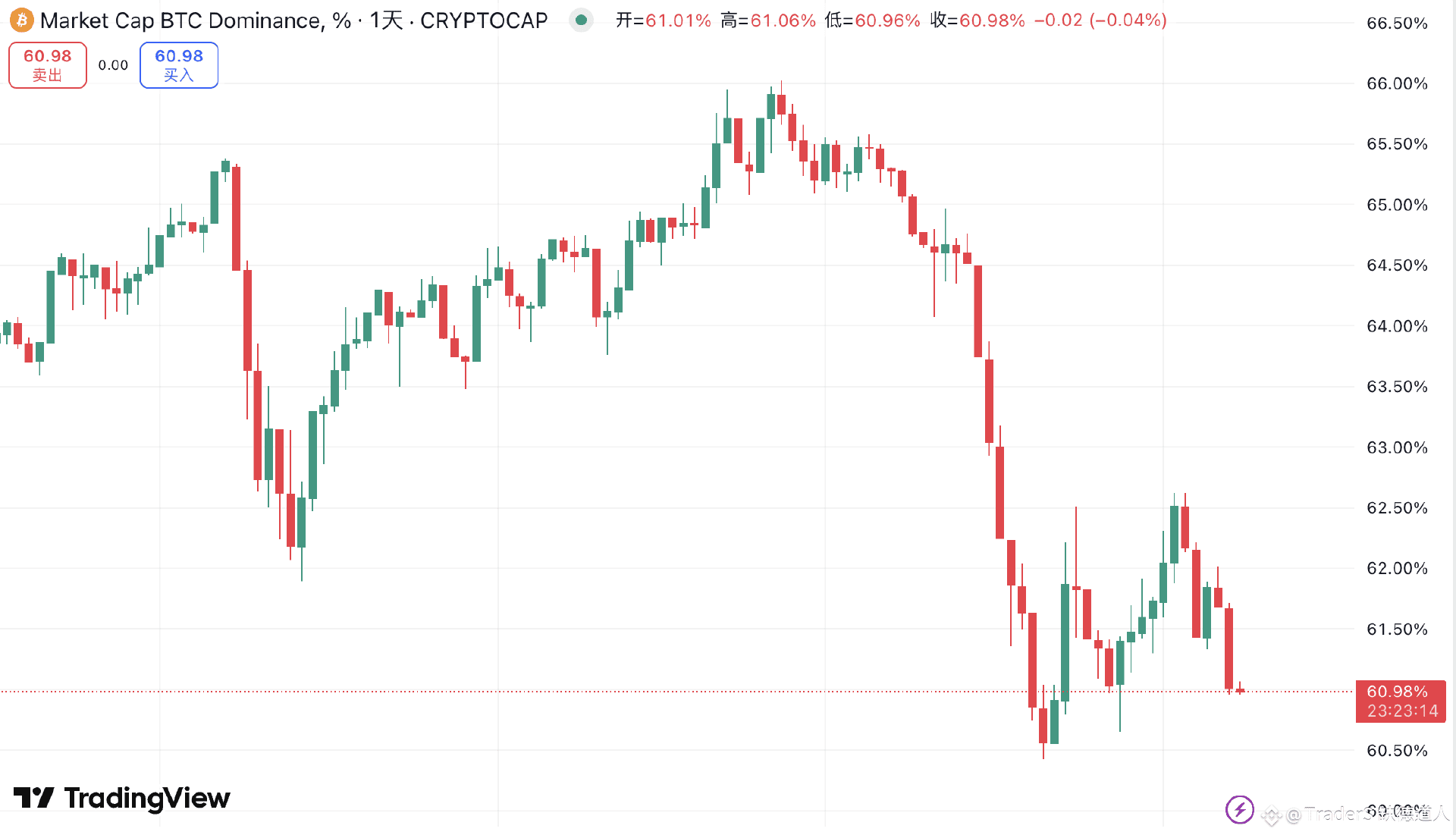 1、市场数据:BTC市值占比下降1.09%至60.98,山寨币指数36