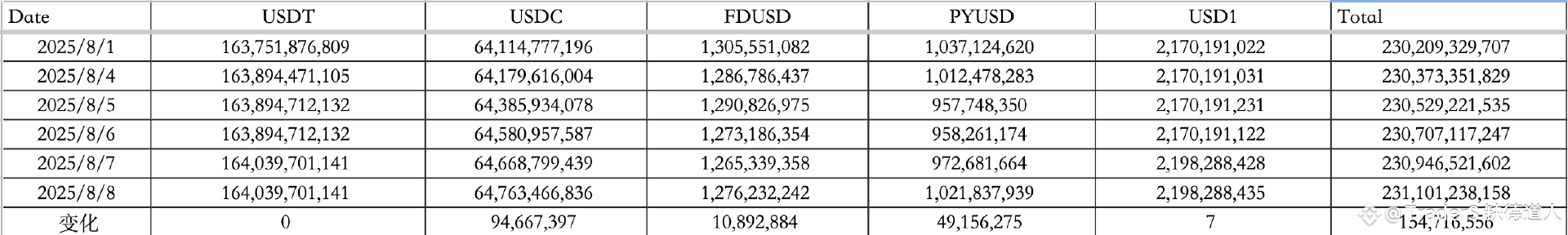 2、稳定币数据:8月8日稳定币流入1.55亿,USDT流入0亿,USDC流入0.95亿,当前总量2311.0亿